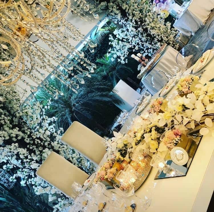 Um Salão com jardim interior, com capacidade para mais de 400 pessoas, chão em madeira, ar condicionado, tecto e paredes com arte do arquitecto Paulo Alzamora.